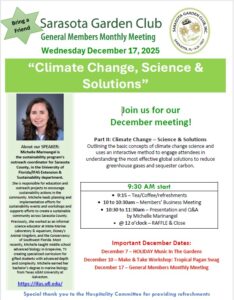 SGC – DECEMBER General Members Monthly Meeting – Climate Change, Science & Solutions Event Details Date: December 17, 2025 9:15 am – 1:00 pm Categories: Event, Sarasota Garden Club Share this: Click to share on Facebook (Opens in new window) Facebook Click to share on Pinterest (Opens in new window) Pinterest Click to email a link to a friend (Opens in new window) Email